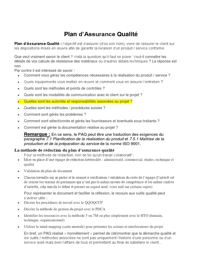 Web dassurance qualité sont brièvement énoncées. Web Plan Assurance Qualité et Méthodes Agiles. Web Le Plan dAssurance Qualité PAQ est lengagement du Prestataire quant.